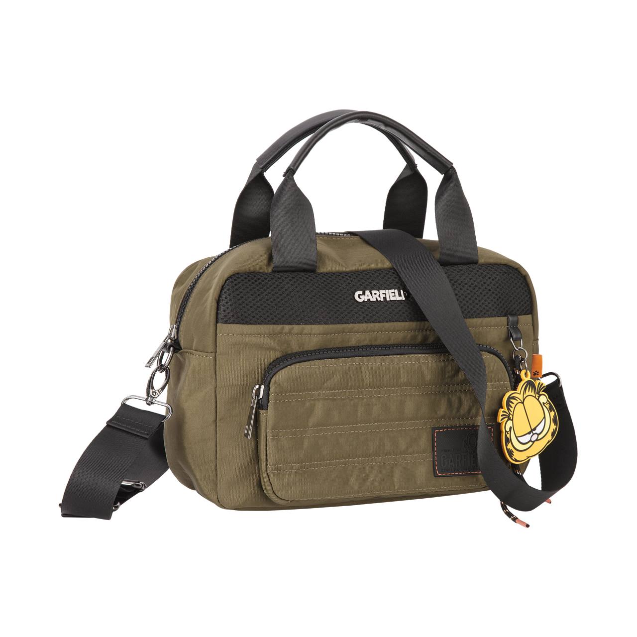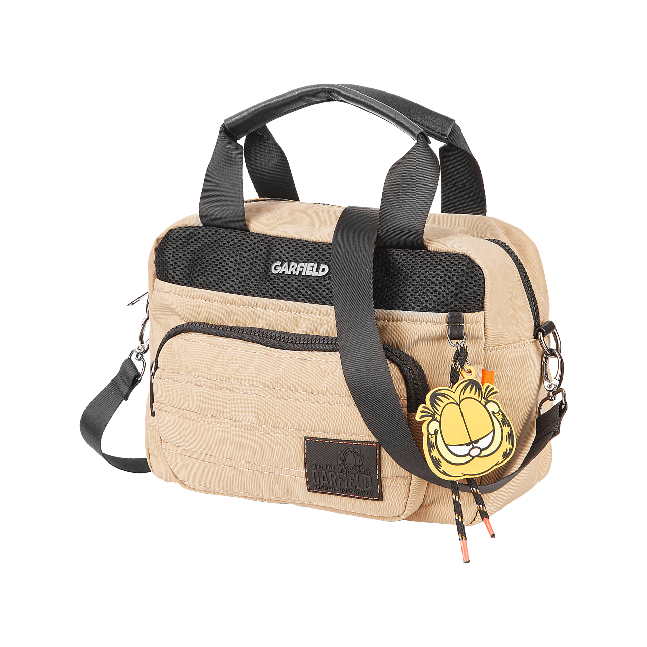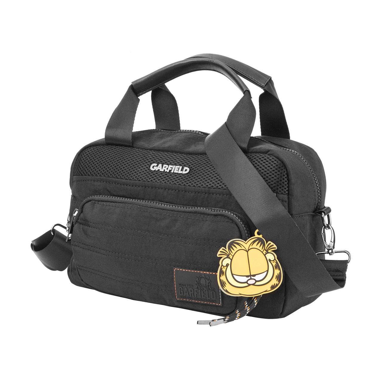 Os shapes funcionais em tecidos inteligentes e adaptáveis, como o nylon, combinados aos puxadores de cadarço, complementam o viés esportivo desta linha. Já as etiquetas e chaveiros personalizados, refletem a atitude autêntica e irreverente do personagem Garfield, arrematando o visual.