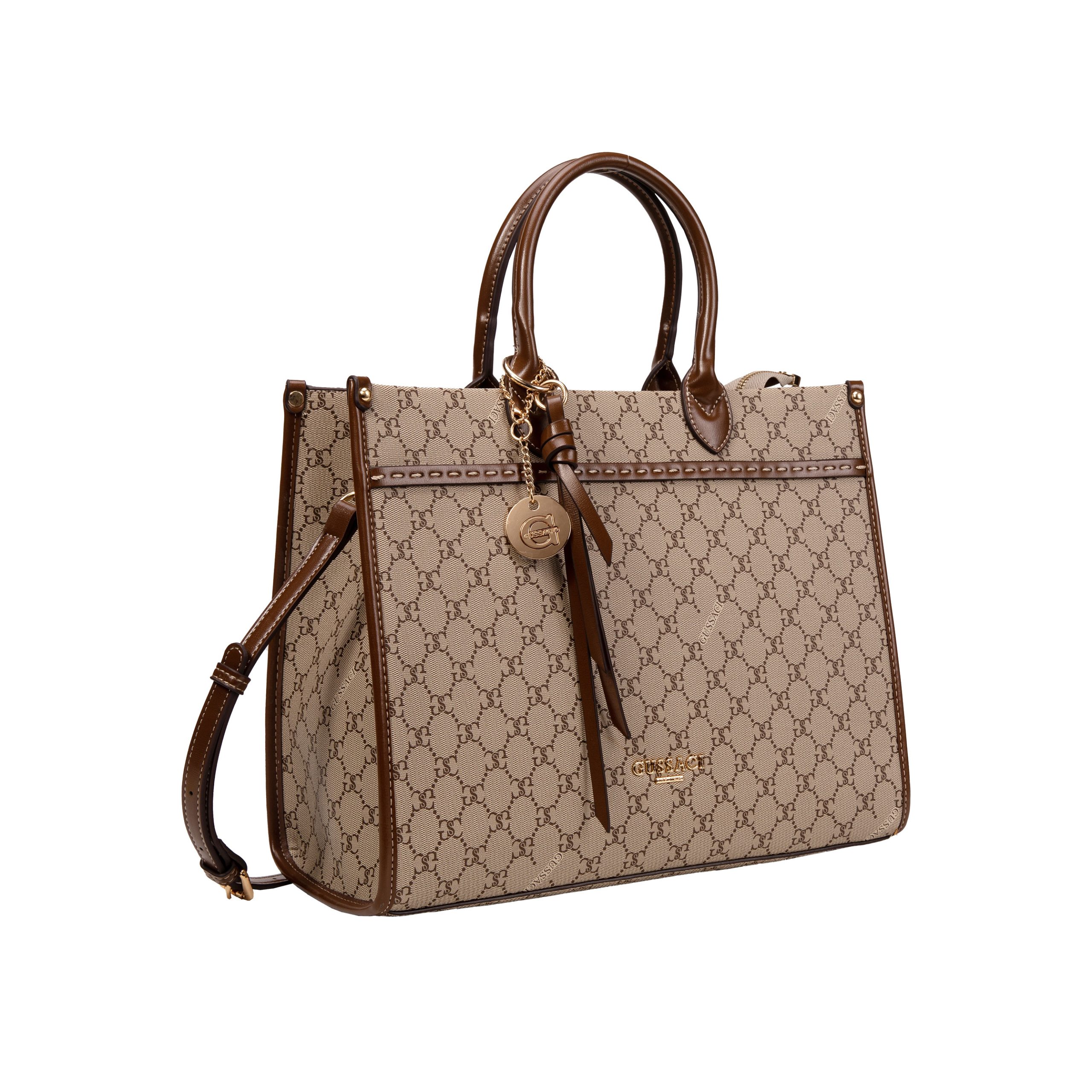 Confeccionada em material dublado e texturizado com monograma » Acompanha chaveiro » Metais light gold.